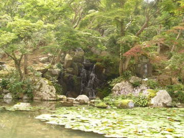 ![]() 池には睡蓮の花が終りかけていました。奥に滝が 見えます。 |