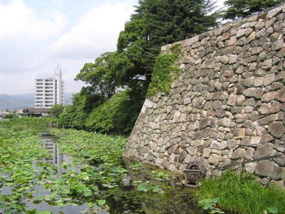 ![]() 石垣と濠 城跡上から見た石垣と濠です。画面の奥は京阪電車淀駅の プラットホーム。 |